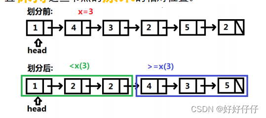 已知链表头指针head和数值x,将所有小于x的节点放在大于或等于x的节点前,且保持这些节点的原来相对位置。