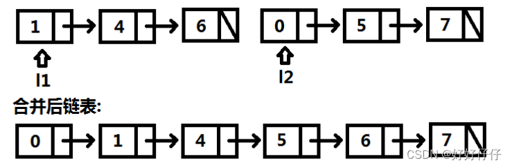 已知两个已排序的链表头节点指针l1和l2,将这两个链表合并,合并后仍为有序的,返回合并后的头节点。