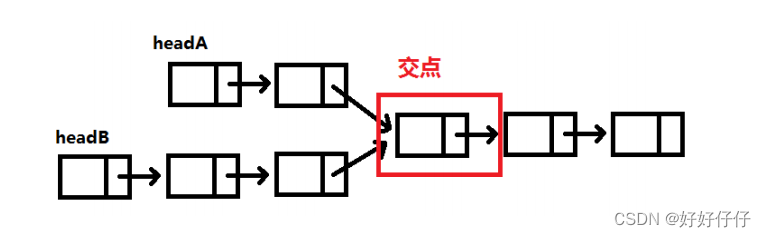 已知链表A的头节点指针headA,链表B的头结点指针headB,两个链表相交,求两链表交点对应的节点。