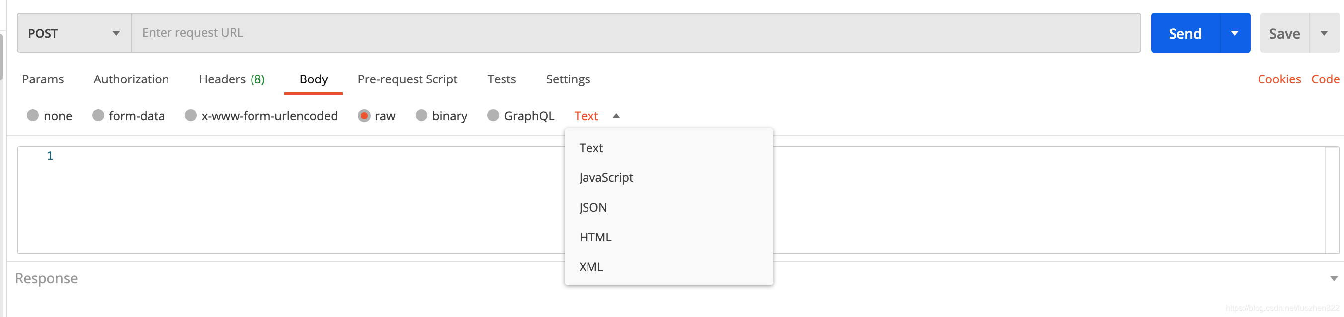 8 raw:可以上传任意类型的文本,比如text、json、xml等,所有填写的text都会随着请求发送;