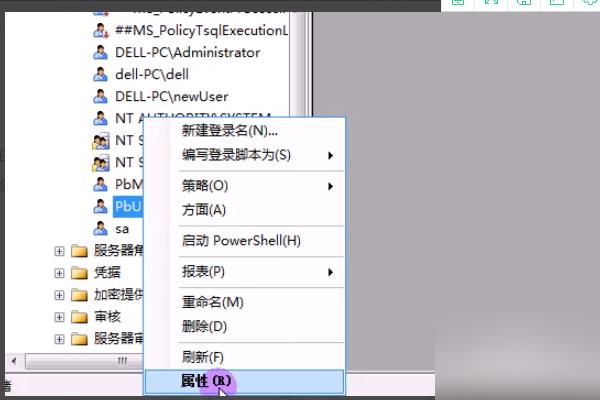4、下面我们登录sa用户,找到这个用户,右键单击选择属性。