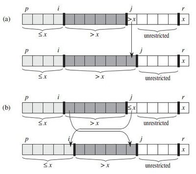 其原理是,将待排序的数组分成三个区:第一个区是小于等于中间值的,第二个区是大于中间值的,第三个区是待处理的。