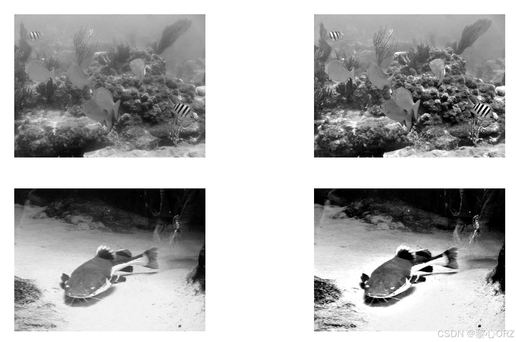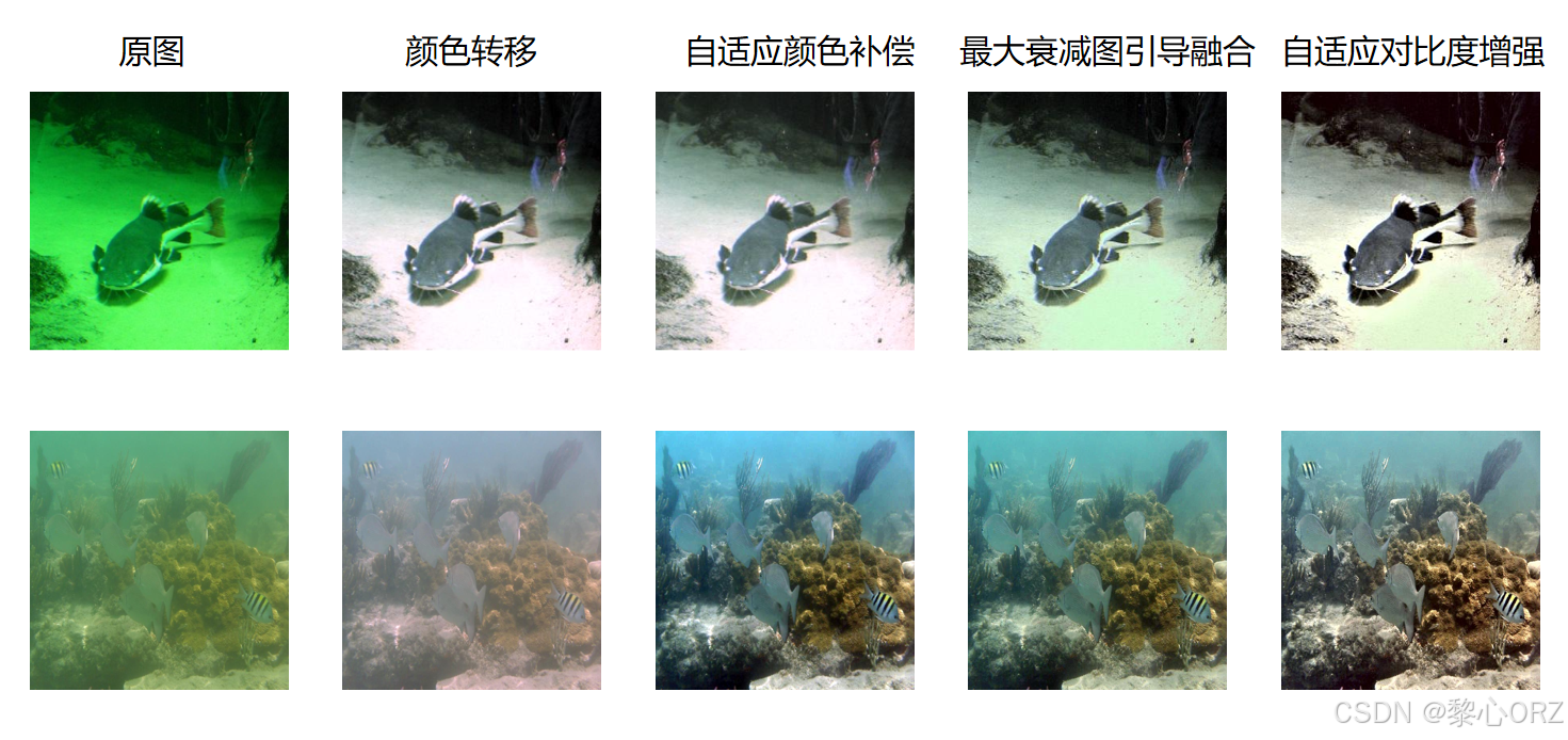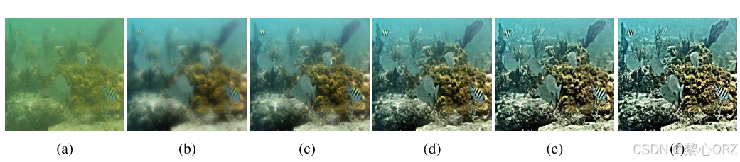 - 增强类方法:在增强水下图像对比度和亮度上有一定表现,但往往容易出现过度增强以及过饱和等不良情况,影响图像最终的视觉质量。