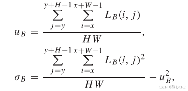 首先假设局部块B是亮度通道L的局部积分图像,其中积分块B的左上角的顶点位置是(x,y),局部块的高度和宽度是H和W,并且局部块的灰度矩阵是LB(x,y),局部块的均值和方差。它可以表示为: