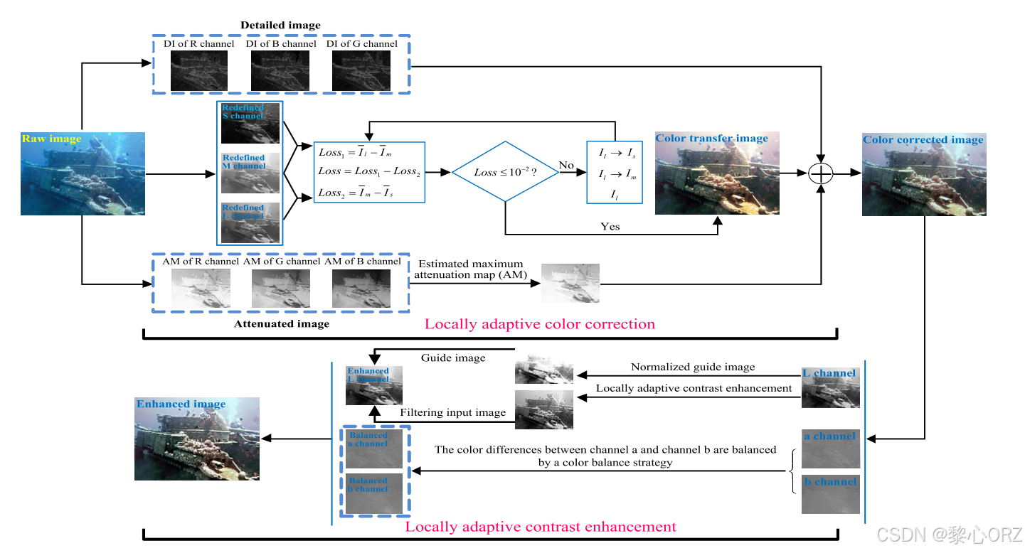1、在局部自适应颜色校正环节:先是将水下图像转换为细节图像(DI)、衰减图像(AM)以及三个重新定义的颜色通道。接着依据最小颜色损失原则进行颜色补偿,由这三个重新定义的颜色通道得到的颜色补偿图像被视作颜色转移图像。之后,利用最大衰减图引导的融合策略,对细节图像、衰减图像以及颜色转移图像进行自适应融合。