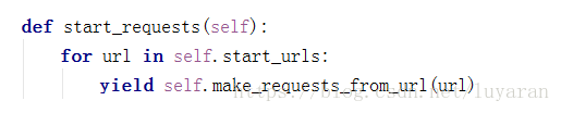 - 4.定义需要爬取的url,放在列表中,因为可以爬取多个url,Scrapy源码是一个For循环,从上到下爬取这些url,使用生成器迭代将url发送给下载器下载url的html。源码截图: