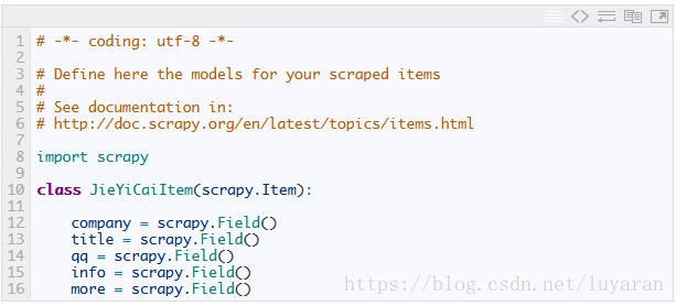 - items.py 设置数据存储模板,用于结构化数据,如:Django的Model