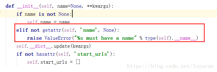 - 2.必须定义name,即爬虫名,如果没有name,会报错。因为源码中是这样定义的: