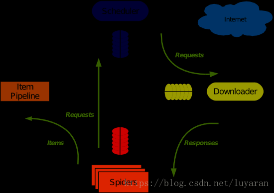 Scrapy 使用了 Twisted异步网络库来处理网络通讯。整体架构大致如下
