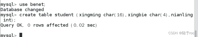 (2)在benet数据库中,创建一个表student,表中有四个字段,分别是xingming(字符长度16),xingbie(字符长度4),nianling(int)