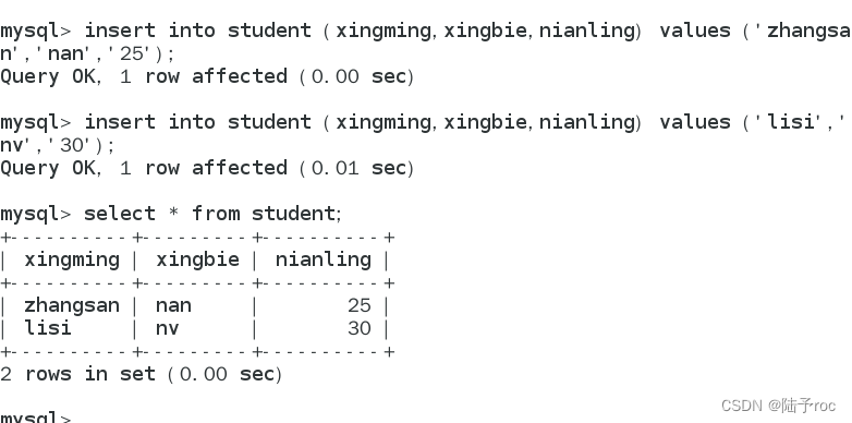 Lisi,nv,30并查询student表中有哪些数据,是否与上面输入的数据一致。