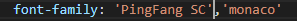 定义如下图字体,PingFang SC是苹果电脑默认渲染的字体,而window系统网页默认渲染字体大多是Mircosoft Yahei,这取决你系统设置的默认字体是什么,如下,如果你使用的是window系统,PingFang SC因为是苹果字体,所以失效,接着找后面一个,如果monaco在你本地系统中存在,即使用该字体,如果不存在就使用默认字体。