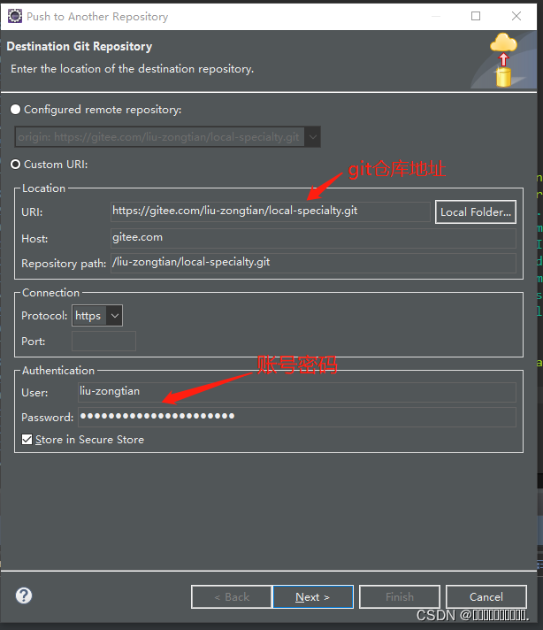 提交到本地仓库后,接着右键项目目录-->Team-->Remote-->Push... 上传到git仓库