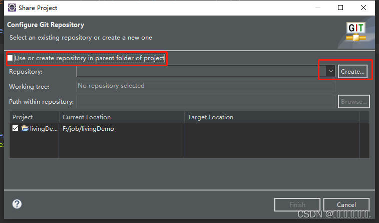 之后你可以勾选Use or create repository in parent folder of project这个选项,在项目的父文件夹中使用或创建存储库,也可以点击Create...创建一个本地仓库