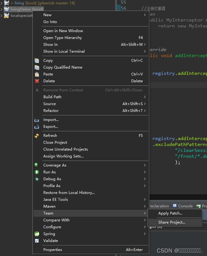 1、右击项目目录->Team->Share Project,弹出页面如图: