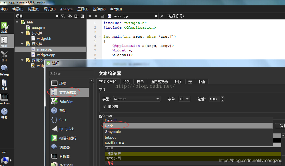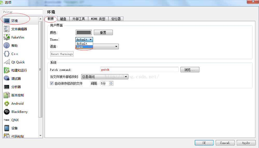 2.之前的一些版本在“环境--概要”里面可能没有Theme(主题)选项,跳过第二步直接在第三步设置就行了,如下图。如果还是不行,则需要下载一个主题文件,将dark.css拷贝到qtcreator程序所在的目录"QtCreator\bin",然后在命令行启动QtCreator。进入QtCreator程序目录,qtcreator –stylesheet dark.css就可以看到效果了。