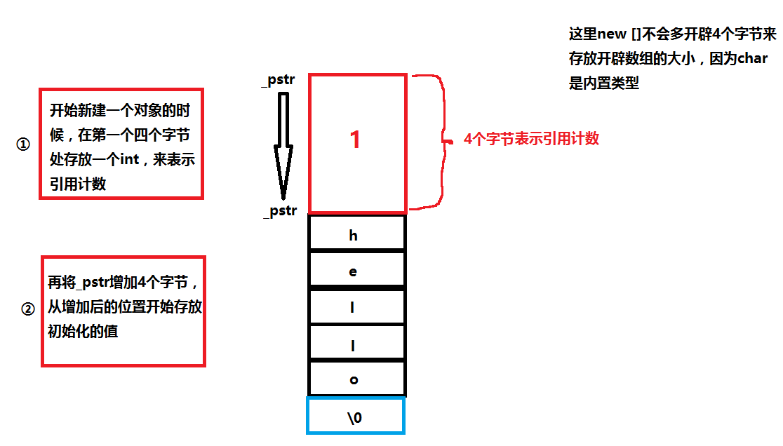 *((int*)_pstr) = 1;//每次新构造一个对象将前4个字节赋值为1,表示新开辟的空间引用计数为1