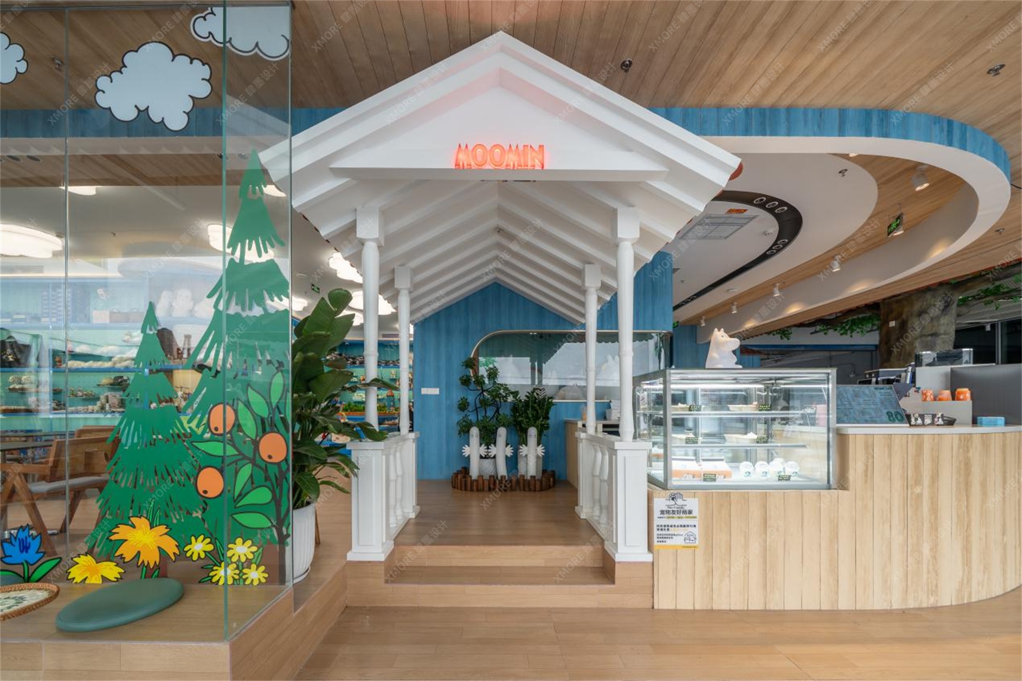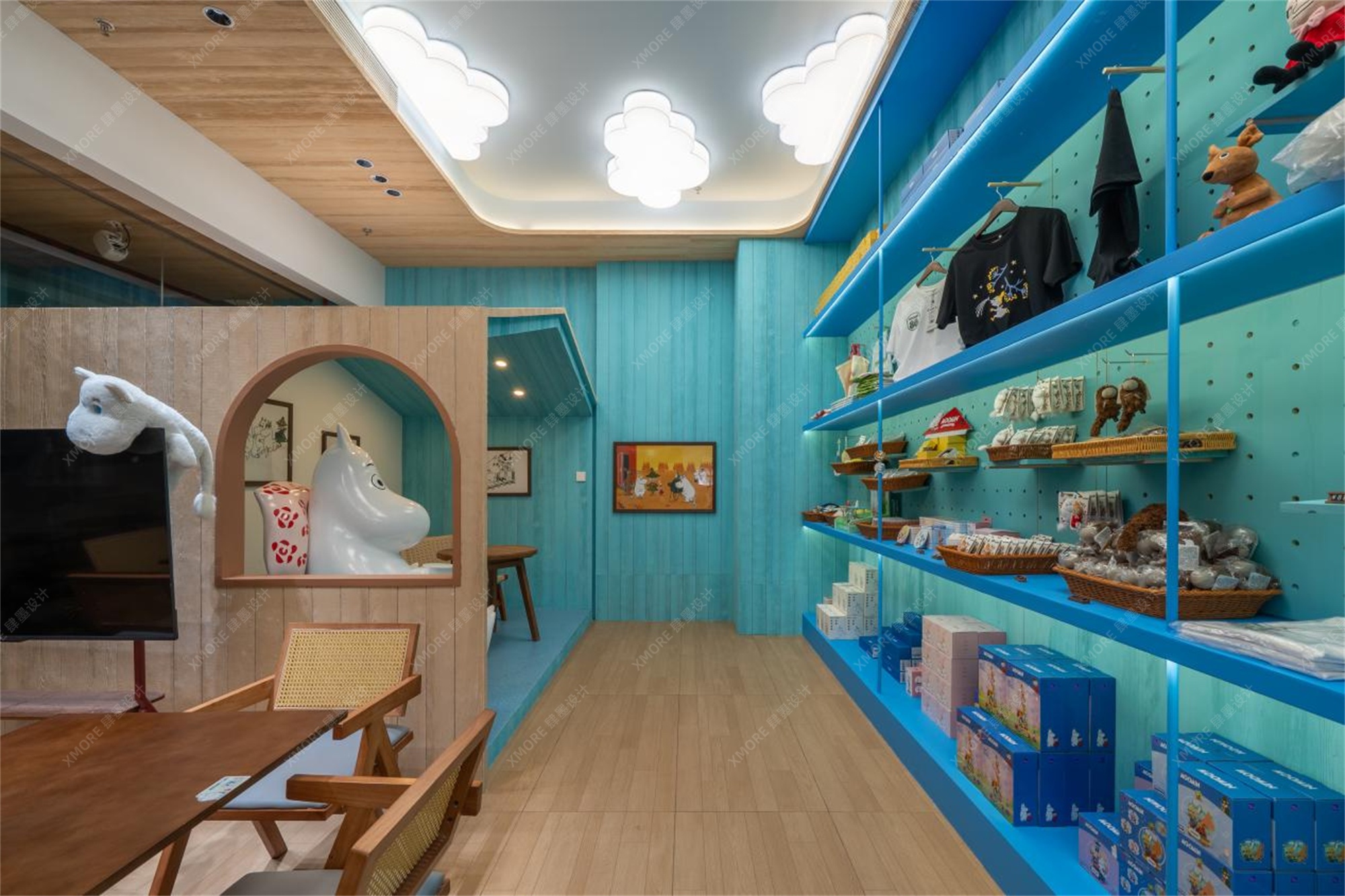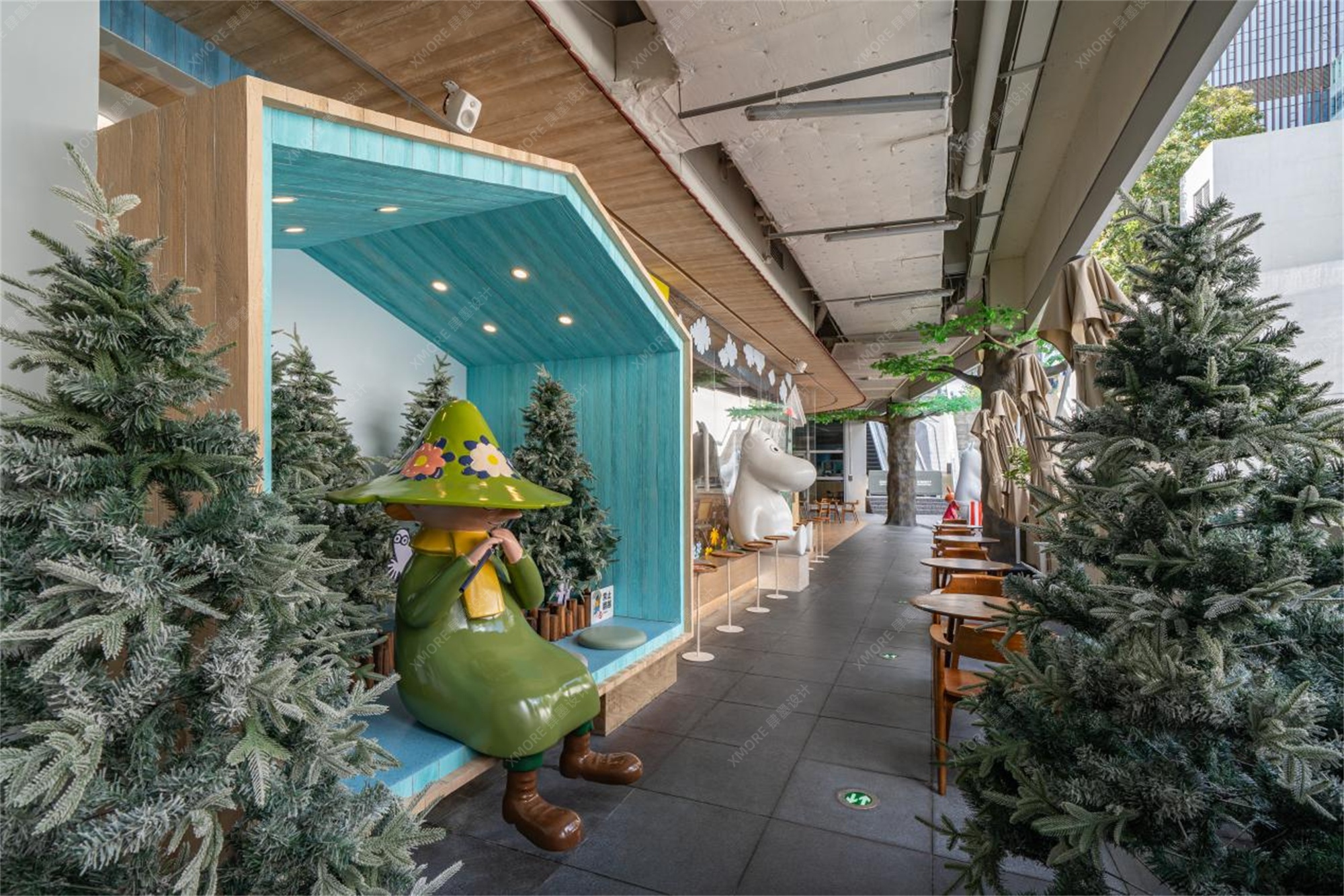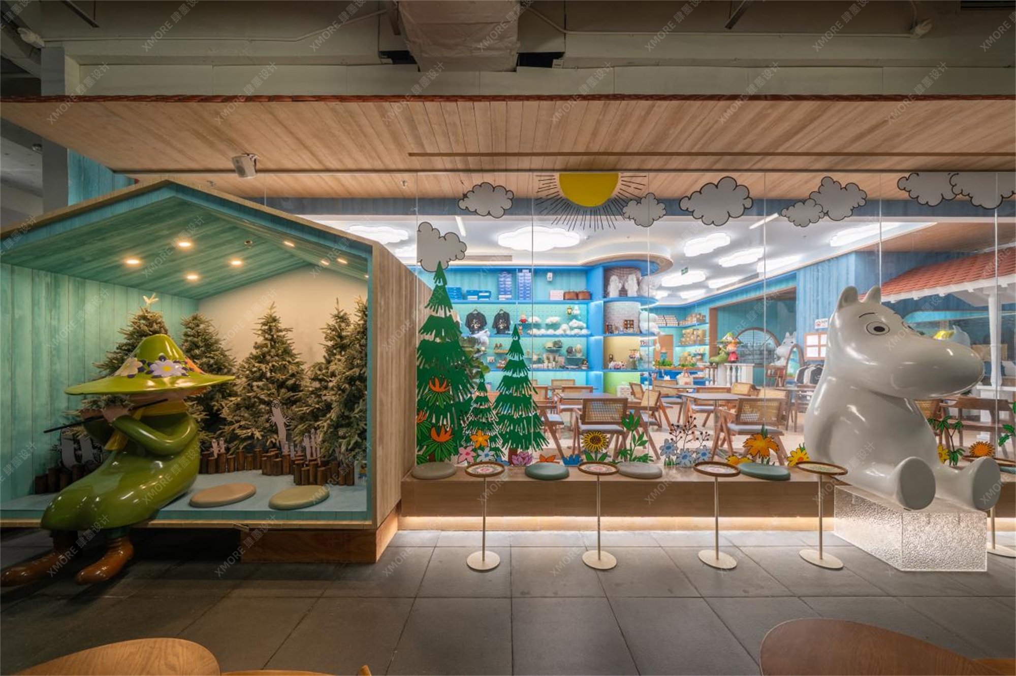 步入空间,访客即刻从繁华都市切换至童话频道。肆墨设计团队对动漫主题快闪场景设计的深刻理解在此展现。纯白色的姆明小屋、戴着标志性花朵帽的绿色姆明大型雕塑、点缀着白云灯的蓝天式天花板,以及遍布空间的仿真绿植,共同构建了姆明山谷的微观缩影。