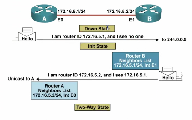 当设备收到对端发送的hello包中携带了自身的RID,那么该设备才 能进行two-way(双向通讯状态)---为了保证hello报文的可靠传输 Two-way状态,标志参数比对成功,邻居关系建立的标志