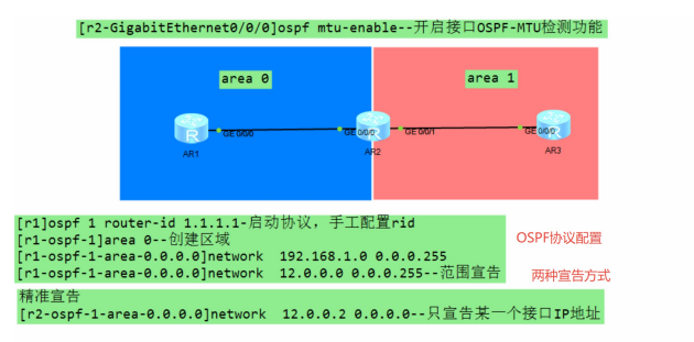 反掩码:掩码的逻辑相反,子网掩码为1的部分代表网络位,子网掩码为0的部分代表主机位,反掩码则是反掩码为0的部分代表网络位,反掩码为1的部分代表主机位。 例如:192.168.1.0 /24--掩码为255.255.255.0反掩码则为 0.0.0.255 也可以仅宣告该接口本身的IP地址--精准宣告反掩码为0.0.0.0(可以避免误宣告)
