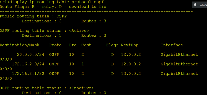OSPF--针对环回接口视为是一种特殊网络环境,认为环回接口只能配置一个IP地址,所以在生成路由时,会直接按照掩码全1来生成路由信息。没有主机位,就意味着该地址不可变。 Pre(优先级,此为华为体系的优先级,其他体系优先级有所不同)--OSPF 10 静态 60 RIP 100