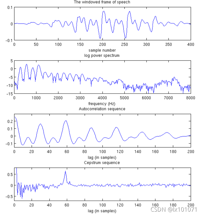 在上述图片中,展示了原始语音信号的一帧数据、对数功率谱、自相关序列和倒谱。倒谱当中的峰值对应自相关序列当中的一个峰值,但是更为清晰。这个峰值的位置在58sample位置处,对应的基音频率为(16000/58)=275Hz (信号采样率为16kHz)。这是一个相当高的基音频率,原始语音信号是从一位女性说话人得到的。因为倒谱的强峰值,所以经常被用于基音检测。