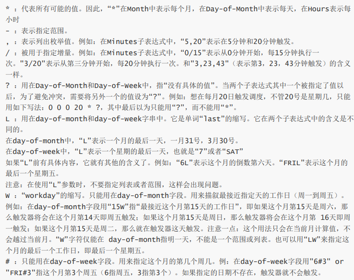 cron表达式是任务调度中的一种通用表达式,所有任务调度技术都支持,是用来描述任务的执行 时机;