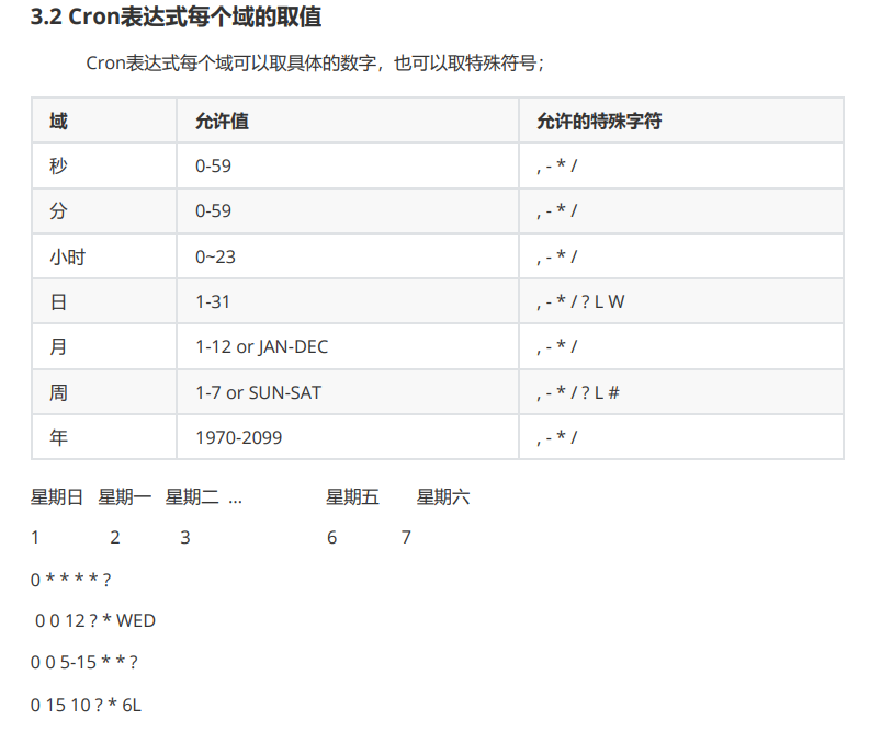 cron表达式是由6部分或者7部分组成,有些框架支持7部分,有些框架支持6部分;每个部分称为 一个域; 如果是由7个域构成,对应的是:秒 分 时 日 月 周 年; 如果是由6个域构成,对应的是:秒 分 时 日 月 周;