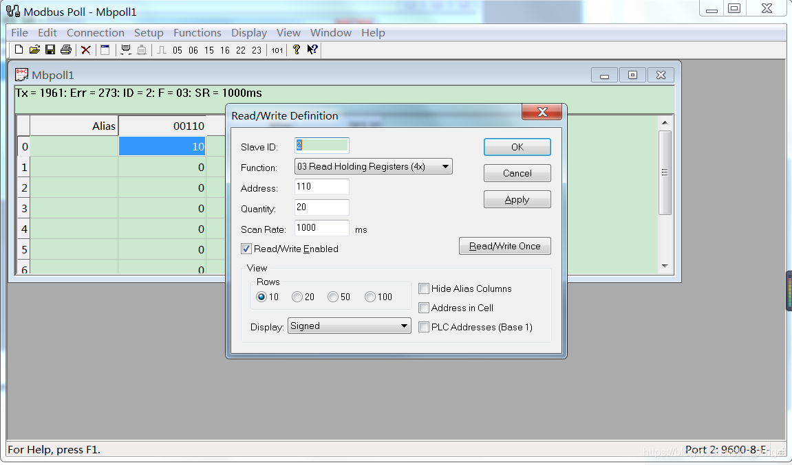 - 设置Setup-Read/Write definition,SlaveID需要跟Slave从站设置相同,Scan Rate:间隔时间