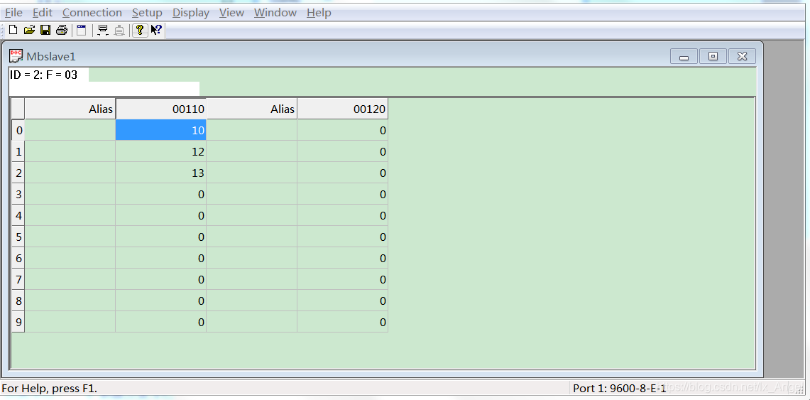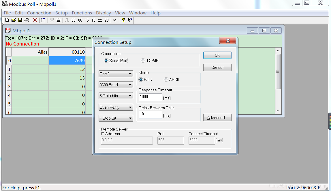 - 设置Connection-Connection Setup,根据上面设置RTU连接方式,Modbus Poll设置如下:(Slave设置的串口参数必须如下的配置相同)