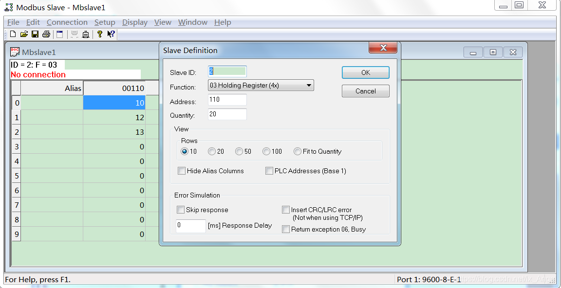- 设置SetUp-Slave Definition,Master设置的SlaveID必须跟下图配置的保持一致,Function:功能码,Address:显示的寄存器起始地址,Quanity:寄存器的数量
