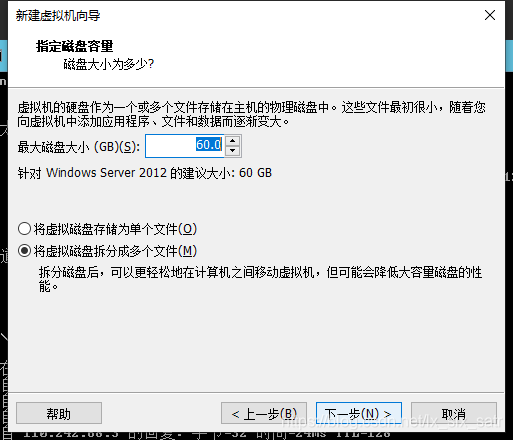 b. 之后傻瓜式的下一步下一步,到这里注意下,磁盘这里要选择第一条:将虚拟磁盘存储为单个文件。原因:会出错,自己一个个坑踩出来的,不求甚解,能达到目的就🆗。