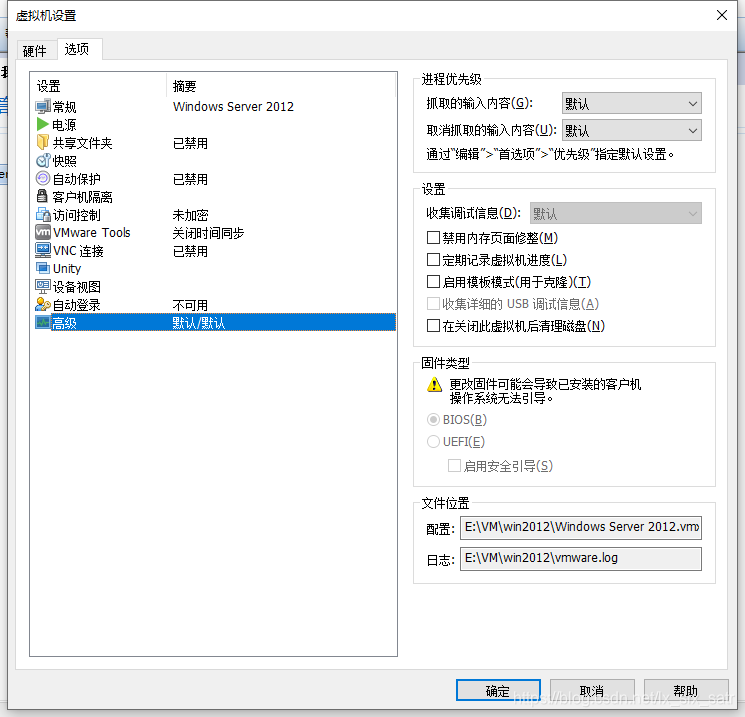 c. 上一步点的快了,如何确认选的哪种方式,右键虚拟机设置,第二个tab选项,最后一个高级,看固件类型是否为BIOS.