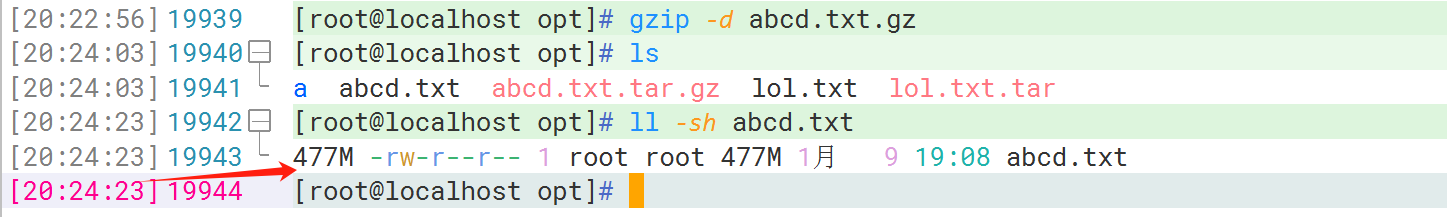 操作过程如下图所示(图中所示解压完abcd.txt文件大小为477M)