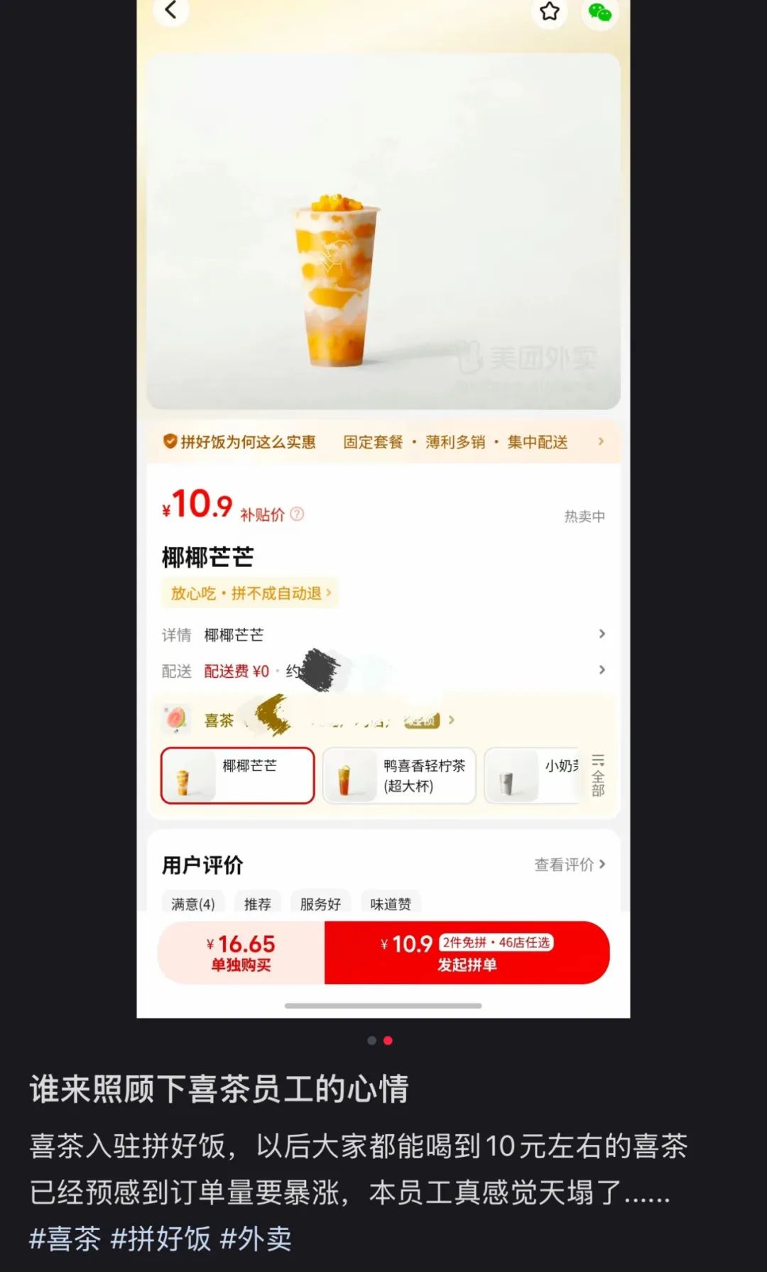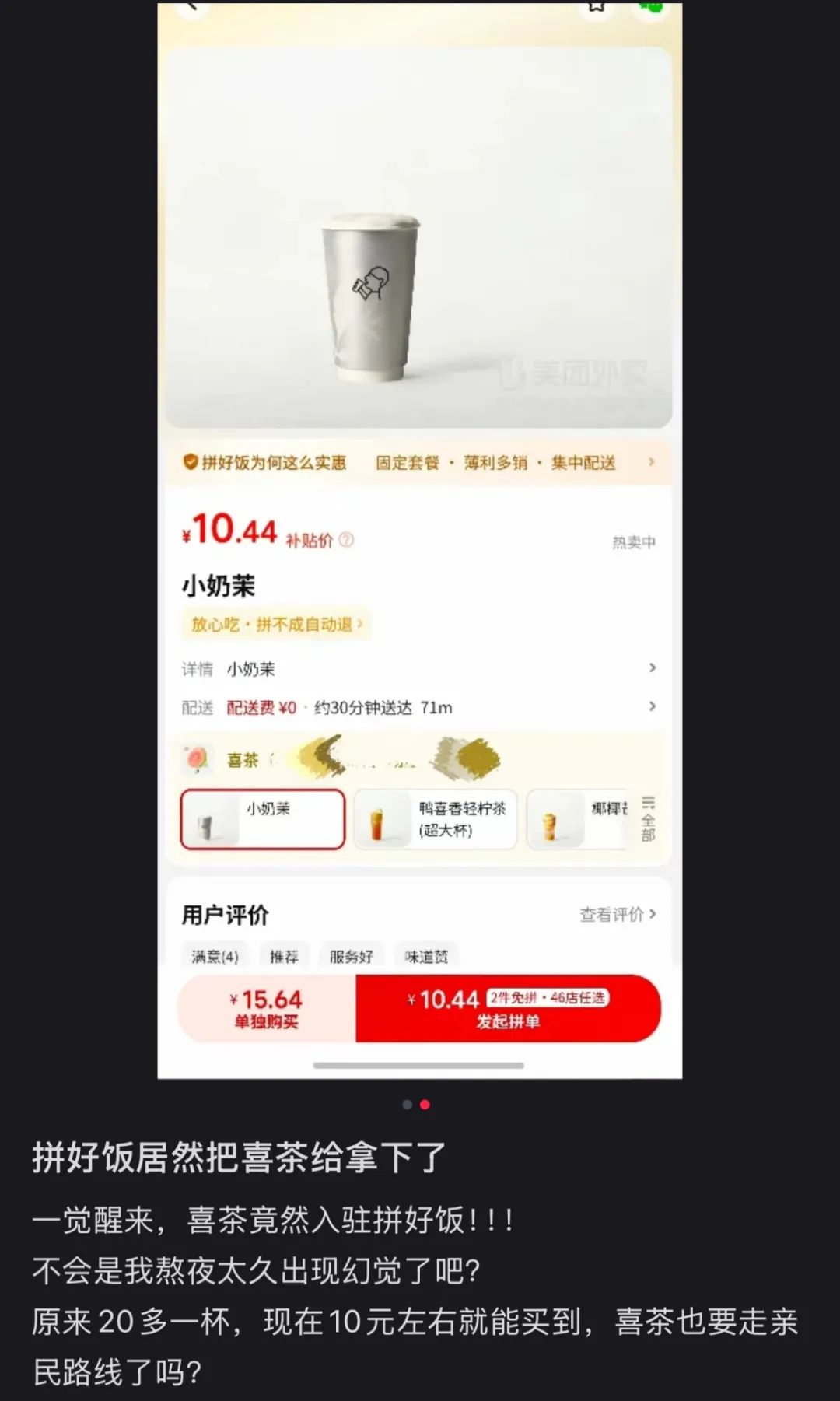 正因此,喜茶低调上线美团拼好饭,双方合作主要集中在低线城市。在贵州、河南、浙江等省份,喜茶也得到了不少消费者的好评。以拼单价喝到喜茶的年轻消费者,大多给出了“喜茶接地气”“第一次喝喜茶,味道确实不错”等评价。这是喜茶和美团之间一次更深入的合作,双方是在新茶饮行业共同寻找增量市场。