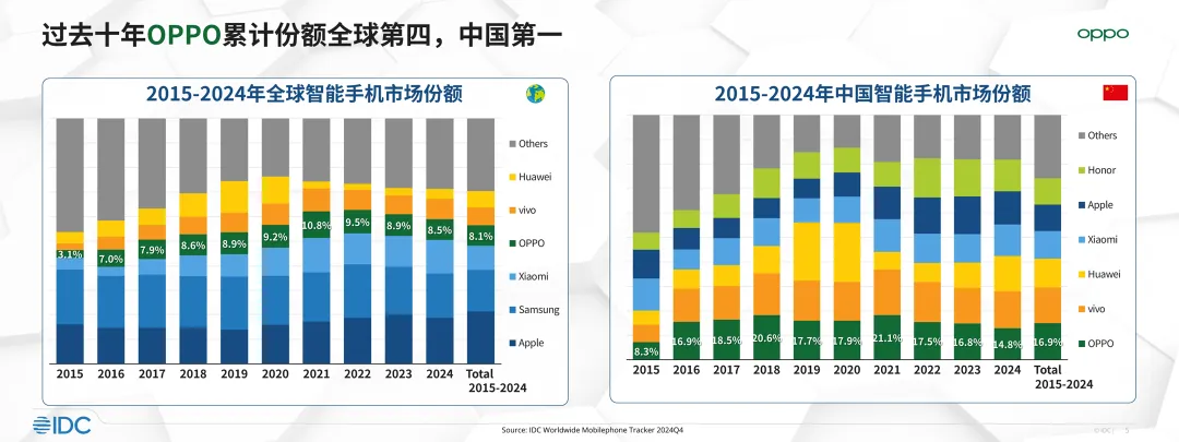 这也让OPPO在全球快速奔跑。IDC发布的报告显示,2024年OPPO在全球中高端市场份额排名第一(450-500美元区间),市场份额达19.3%,过去十年累计市场份额全球第四,中国第一。