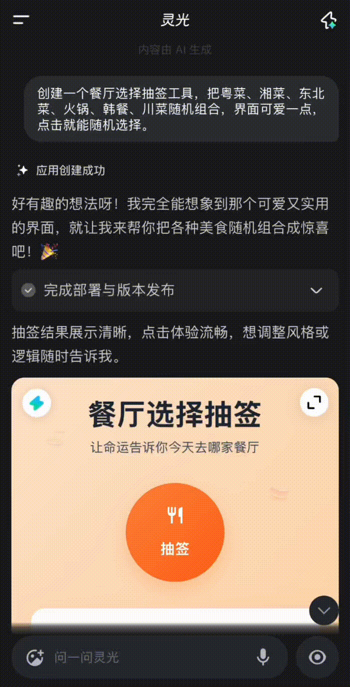 一组数据说明了用户用灵光“闪应用”的热情:上线仅两周,用户已成功创建330万个“闪应用”,其中多数都是深入日常生活的实用应用,从情绪减压到语言打卡,从美食抽签到旅行规划,渗透生活的每一处细微场景中。