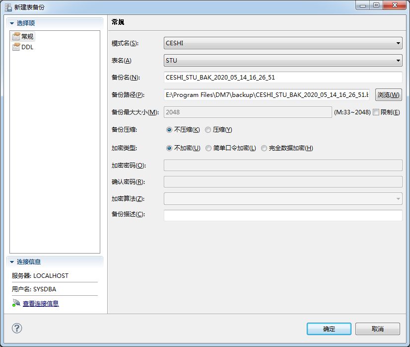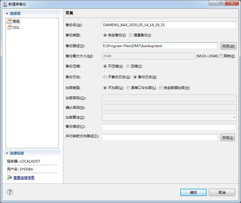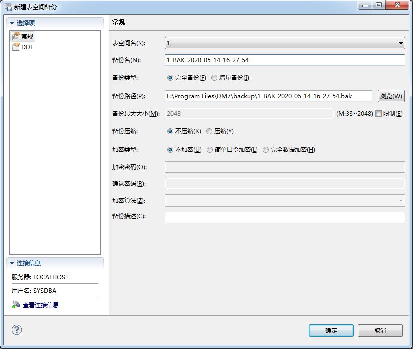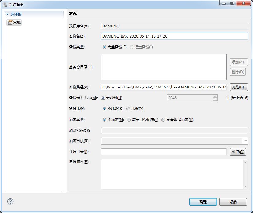 根据实际情况填写备份名;备份路经;选择进行完全备份还是增量备份,在进行增量备份时需要添加基备份目录;是否对备份大小进行限制;备份是否压缩;是否加密。点击确认则进行备份操作,备份文件可通过备份路径查找。