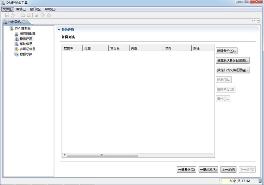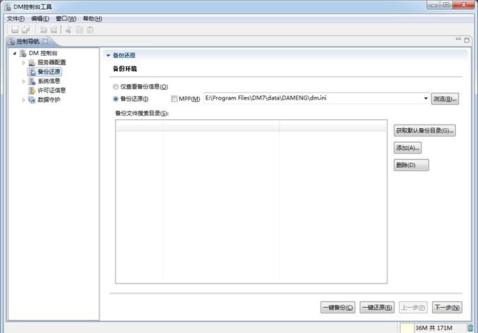 打开DM控制台工具后,选择备份还原,选择待备份目标数据库 dm.ini 文件路径,点击下一步进行详细选择。