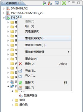 1.打开DM管理工具,用SYSDBA用户登录数据库。右击数据库连接,选择管理服务器。如图一