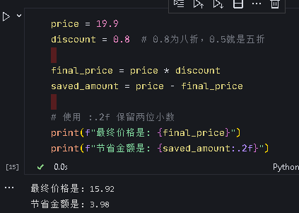 题目: 定义两个浮点数变量,price 赋值为 19.9,discount 赋值为 0.8 (表示 8 折)。计算折扣后的价格,并将结果存储在变量 final_price 中;计算节省了多少钱,存储在变量 saved_amount 中。然后,使用 f-string 分两行打印出类似以下格式的信息。