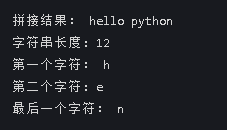 定义两个字符串变量,str1 赋值为 “Hello”,str2 赋值为 “Python”。将这两个字符串拼接起来(中间加一个空格),并将结果存储在变量 greeting 中;计算 greeting 字符串的长度,存储在变量 length 中;获取 greeting 字符串的第一个字符,存储在变量 first_char 中。然后,使用 f-string 分三行打印出类似以下格式的信息: