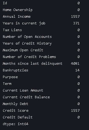 data['Annual Income'].isnull().sum() 再次检查数据是否填补完毕
