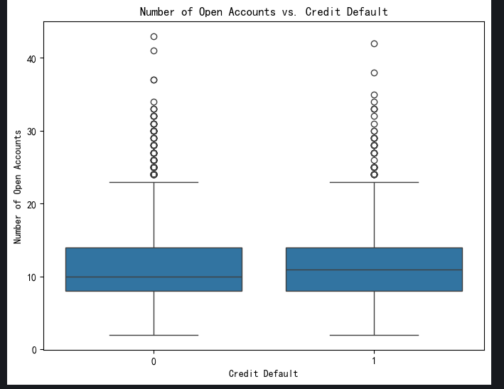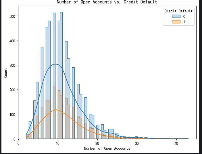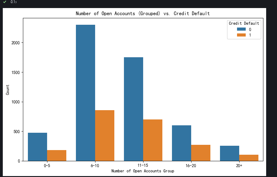 8.由于离散变量Number of Open Accounts 有多个变量 绘制其与标签Credit Default关系的横坐标会挤在一起 需要在代码中进行分组data['Open Accounts Group'] = pd.cut(data['Number of Open Accounts'], bins=[0, 5, 10, 15, 20, float('inf')], labels=['0-5', '6-10', '11-15', '16-20', '20+'])