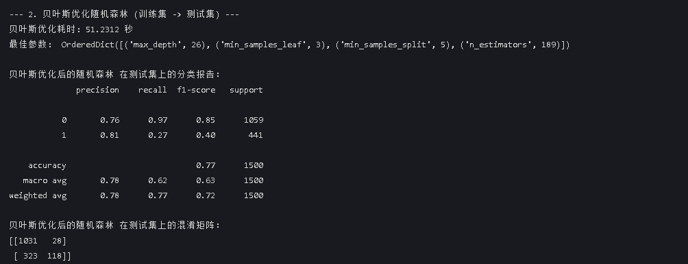 print("\n--- 2. 贝叶斯优化随机森林 (训练集 -> 测试集) ---")