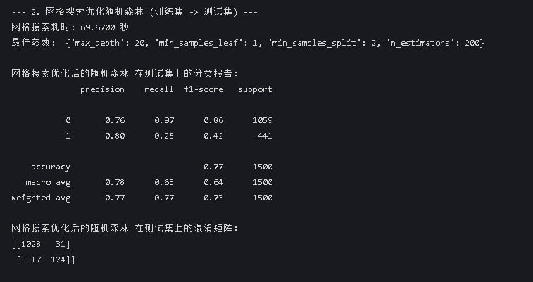 print("\n--- 2. 网格搜索优化随机森林 (训练集 -> 测试集) ---")