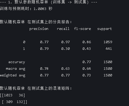 print("--- 1. 默认参数随机森林 (训练集 -> 测试集) ---")