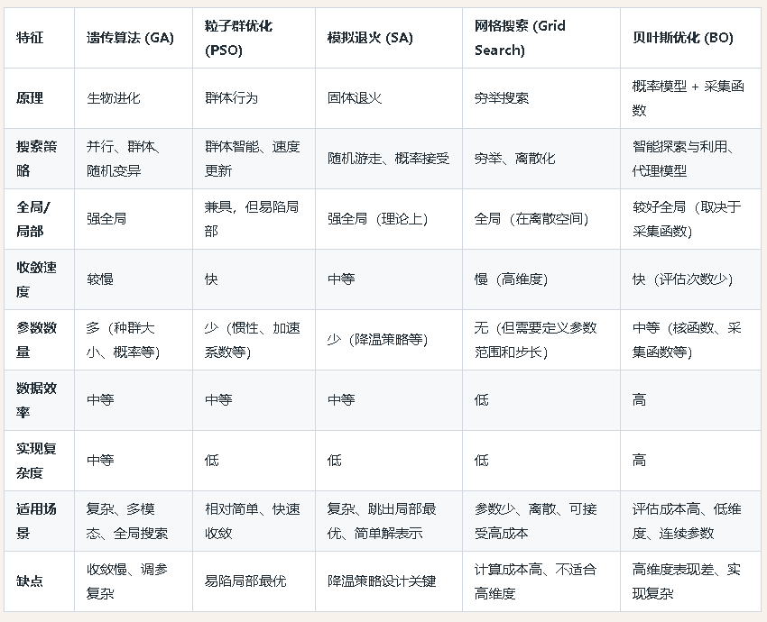 - 如果你的目标函数计算成本非常高,并且参数维度不高(例如,少于20维),并且你想高效地找到最优解,优先考虑贝叶斯优化。