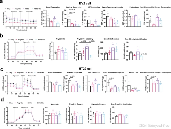 The effects of nicotine on OCR measurement a and ECAR measurement b in BV2 cells (n = 3, biologically independent samples/group). The effects of nicotine on OCR measurement c and ECAR measurement d in HT22 cells (n = 2–3, biologically independent samples/group). The quantitative analysis of OCR including, basal respiration, ATP-linked respiration, proton leak, maximal respiration, spare respiratory capacity, non-mitochondrial oxygen consumption. The quantitative analysis of ECAR including, glycolysis, glycolytic capacity, glycolytic reserve and non-glycolytic acidification. Data are means ± SEM. p values were determined by one-way ANOVA with Tukey’s multiple comparisons tests (a–d).