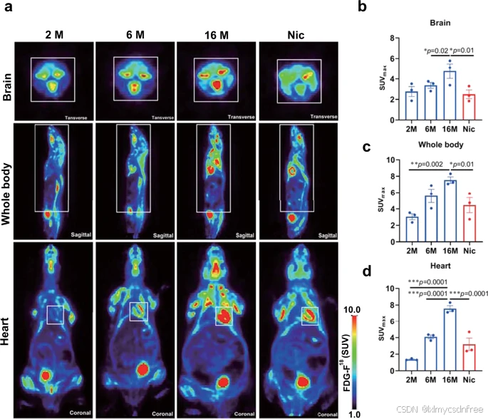 a ROI-wise regional of 18 F-FDG uptake in 2, 6, and 16 months age C57BL/6 mice compared with 16 months age mice with nicotine administration (the white box marks the ROI. The ROI: Transverse: Brain; Sagittal: whole body, Coronal: Heart). b–d Plots show the tissues SUV of 18F-FDG. Data are means ± SEM (n = 3, biologically independent samples/group). p values were determined by one ANOVA with Tukey post hoc correction (b–d).
